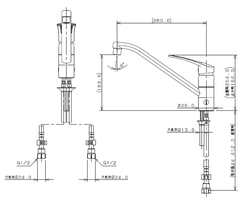 キッチン用蛇口[台][シングルレバー混合水栓][給湯制限レバー][分岐口付][スパウト260mm][寒冷地]