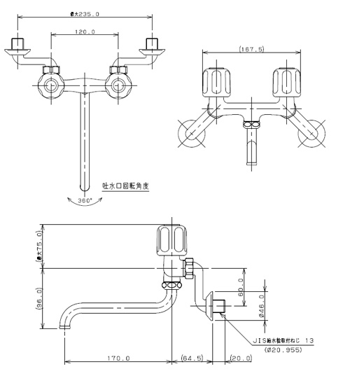 キッチン用蛇口[壁][2ハンドル混合水栓][首長170mm][一般地]