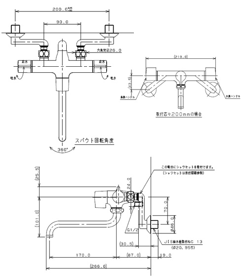 浴室用蛇口[壁][浴槽・洗い場兼用][2ハンドルシャワーバス混合水栓][一時止水][スパウト170mm][寒冷地]