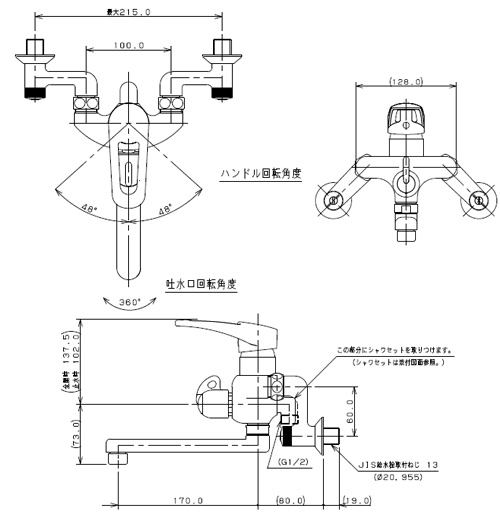 浴室用蛇口[壁][浴槽・洗い場兼用][シングルレバーシャワーバス混合水栓][スパウト170mm][一般地]