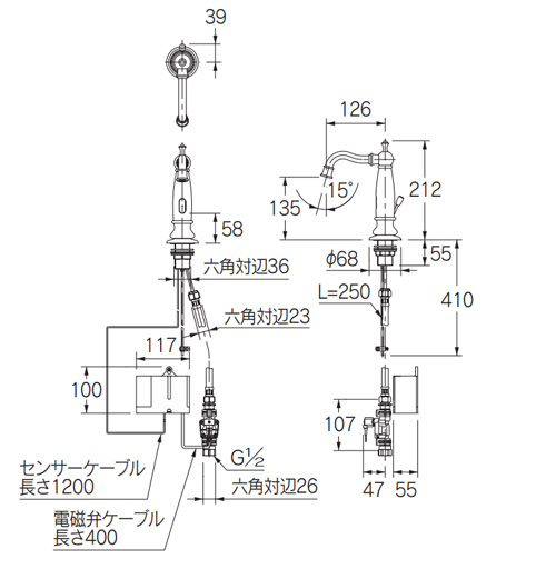 洗面用蛇口[台][自動水栓][単水栓][センサー水栓][乾電池/ACアダプタ][電磁弁][スパウト123mm][吐水口高さ135mm][引き棒付][一般地][オールブラス]