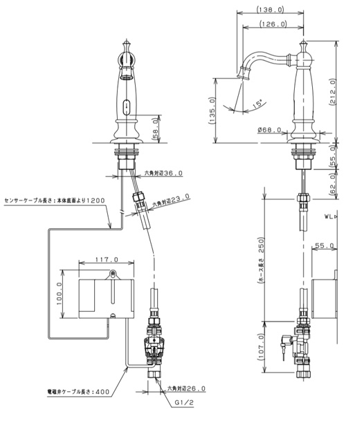 洗面用蛇口[台][自動水栓][単水栓][センサー水栓][乾電池/ACアダプタ][電磁弁][スパウト123mm][吐水口高さ135mm][一般地]