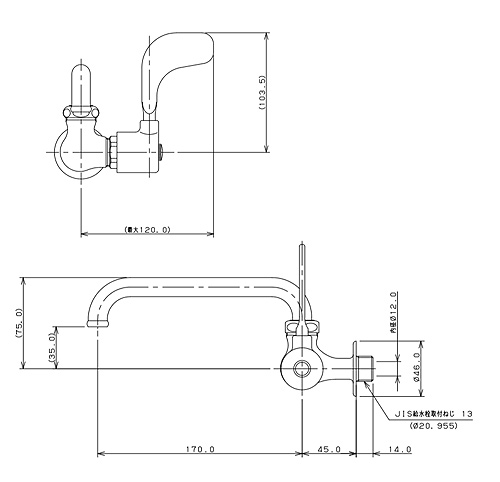 洗面用蛇口[壁][単水栓][レバー式横形自在水栓][スパウト170mm][介護施設向き][一般地寒冷地共用]