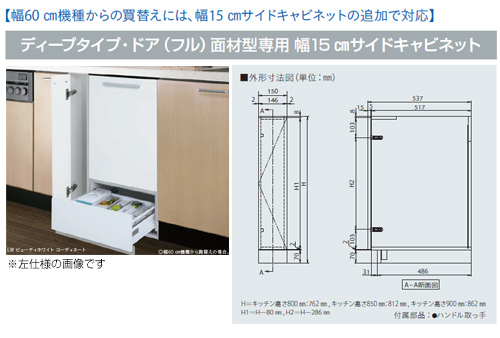 サイドキャビネット[幅15cm][ドア面材型専用][ドアフル面材型専用][キッチン高さ80cm用][右仕様][ビルトイン食洗機部材]