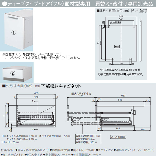 ドアパネルセット[パネル+収納キャビネット][ドア面材型専用][深型][幅45cm][キッチン高さ90cm用][ビルトイン食洗機部材]