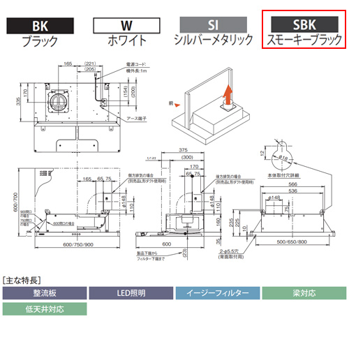●【SALE】♭レンジフード スタンダードシリーズ[シロッコファン][幅60cm][総高さ70cm][スリム型][前幕板付属][スモーキーブラック][左排気]