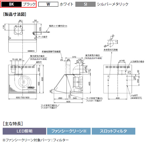 ●レンジフード スタンダードシリーズ[シロッコファン][幅90cm][総高さ60cm][ブーツ型][前幕板付属][ブラック]