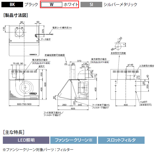 ●レンジフード スタンダードシリーズ[シロッコファン][幅90cm][総高さ60cm][ブーツ型][前幕板付属][ホワイト]