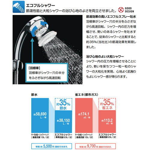 ・ソフトサーモ:お湯と水の混合比を自動調節。温度変化を最小限に抑えるソフトサーモスタット式です。急な温度変化による不快感を解消します。