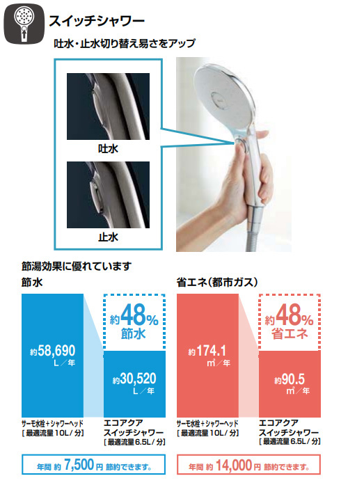エコアクアシャワーで大判のシャワーヘッドと空気を含んだ大粒の水滴で浴び心地のよさを向上。