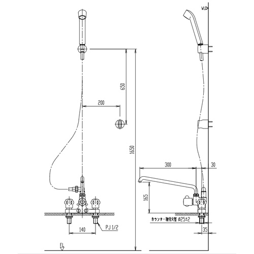 浴室用蛇口[台][浴槽・洗い場兼用][2ハンドル][シャワーバス水栓][ホールインワン専用浴槽水栓][湯水芯140mm][スパウト300mm][寒冷地]