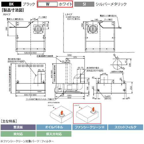 ●レンジフード スタンダードシリーズ[シロッコファン][幅75cm][平型][ホワイト][左排気]