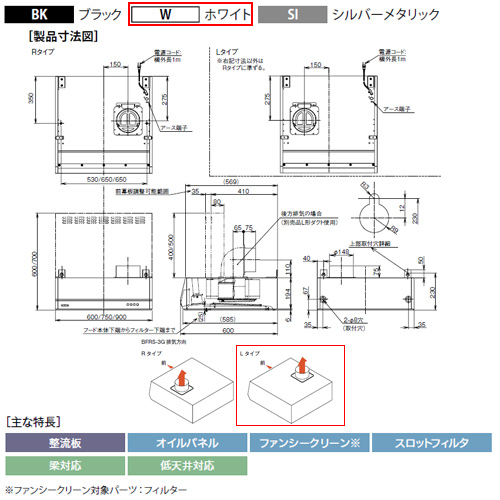●レンジフード スタンダードシリーズ[シロッコファン][幅60cm][平型][ホワイト][左排気]