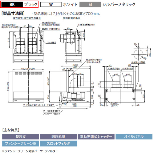 ●レンジフード 同時給排シリーズ[シロッコファン][幅90cm][総高さ70cm][平型][同時給排][給気前幕板付属][ブラック]