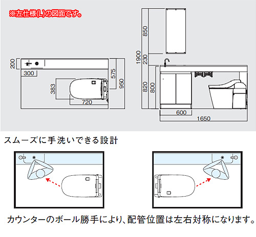 トイレカウンターTS[幅1650mm][ハンドル式単水栓(スワン型)][本体キャビネット・フロアキャビネット付][プランNo.TTS19][左仕様]
