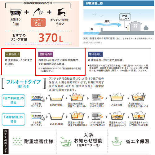 ♪【10年保証付】【工事費込】エコキュート[フルオート][370L][角型][ハイグレード][標準圧][一般地][耐重塩害仕様][スマイル10][リモコン脚部カバー]