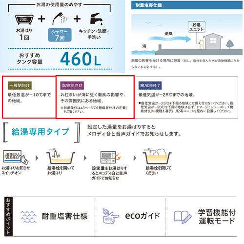 【10年保証付】【工事費込】エコキュート[台所リモコン付属][給湯専用][460L][角型][スタンダード][標準圧][一般地][耐重塩害仕様][スマイル10][脚部カバー]