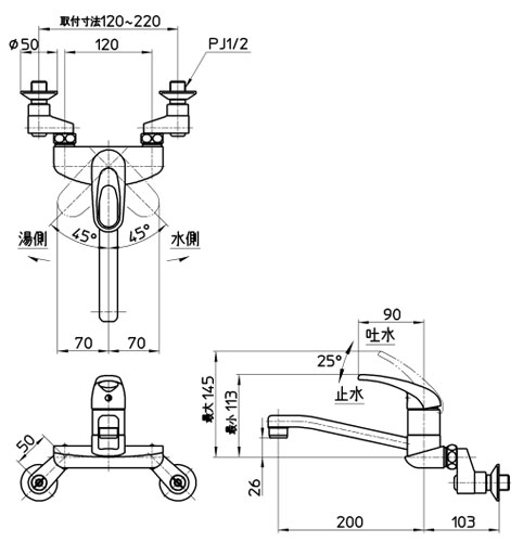 キッチン用蛇口[壁][シングル混合水栓][整流][スパウト200mm][寒冷地]