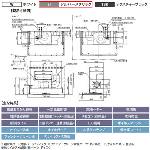 ●レンジフード プレミアムプラスシリーズ[シロッコファン][幅75cm][スリム型][常時換気][コンロ連動][シルバーメタリック][左排気]