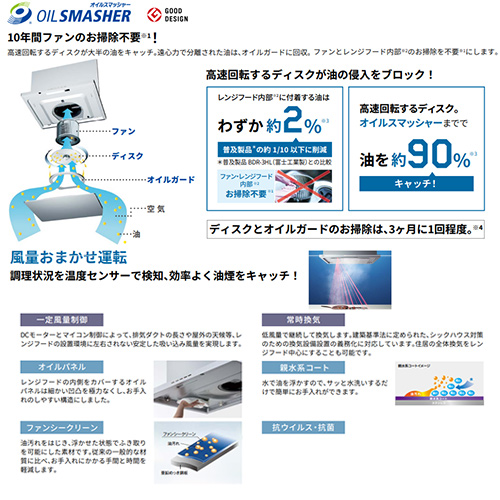 独自の「オイルスマッシャー」により、ファンとレンジフード内部(ケーシング)への油の進入をブロック。