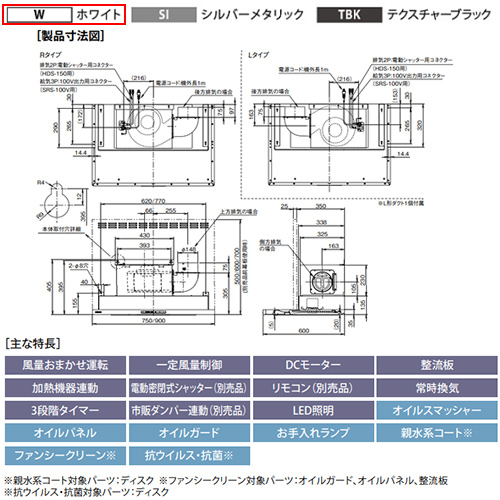●レンジフード プレミアムプラスシリーズ[シロッコファン][幅90cm][スリム型][常時換気][コンロ連動][ホワイト][左排気]