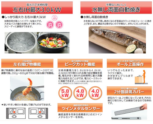 ・揚げ物機能/少量油対応:左右IH6段階(150〜200度)/200g(220mL)