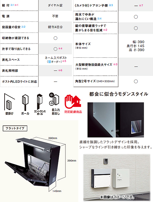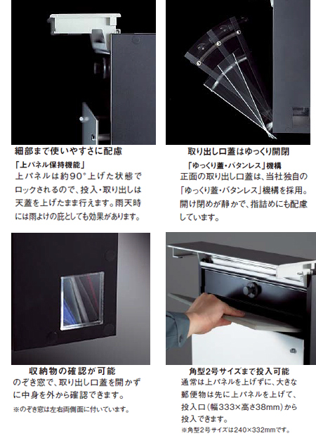 ※一時保管用の一般郵便物の受箱として設計されていますので、貴重品、書類等、危険物、生もの等の保管はしないでください。