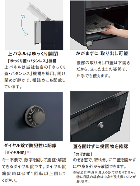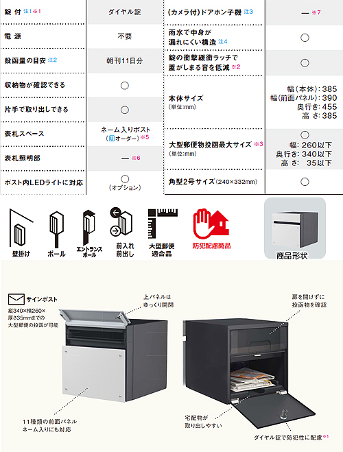 ※一時保管用の一般郵便物の受箱として設計されていますので、貴重品、書類等、危険物、生もの等の保管はしないでください。