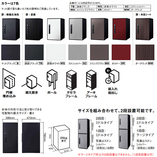 ・設置方法:門扉埋め込み、据え置き、ポール、テセラフレーム、アーキフレーム