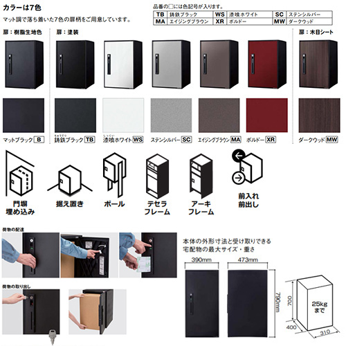 ・設置方法:門扉埋め込み、据え置き、ポール、テセラフレーム、アーキフレーム