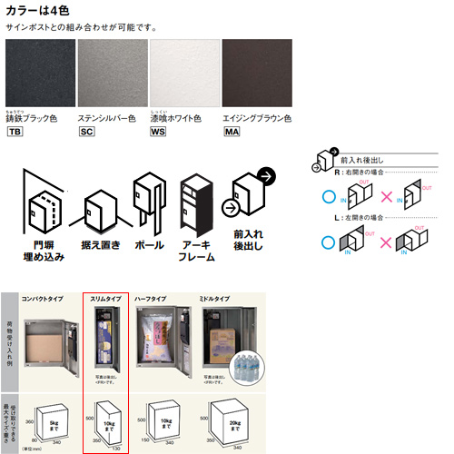 ・設置方法:門扉埋め込み、据え置き(アンカー固定)、ポール、テセラフレーム、アーキフレーム