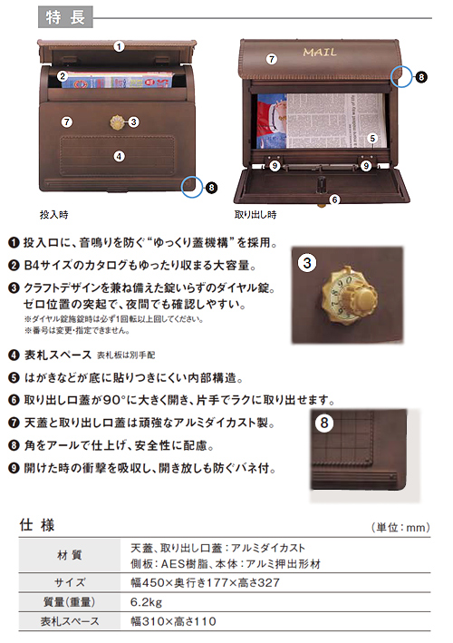※一時保管用の一般郵便物の受箱として設計されていますので、貴重品、書類等、危険物、生もの等の保管はしないでください。