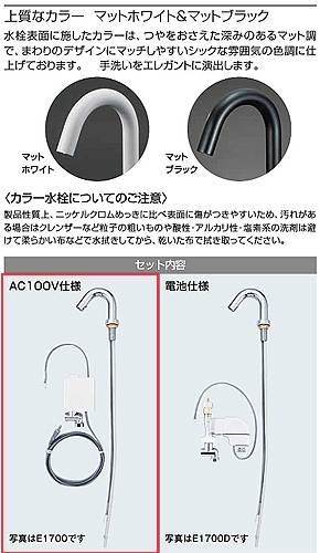 ●洗面用蛇口 E1700シリーズ[台][センサー水栓][自動水栓][単水栓][AC100V][ロングタイプ][吐水口高さ285ミリ][マットホワイト]