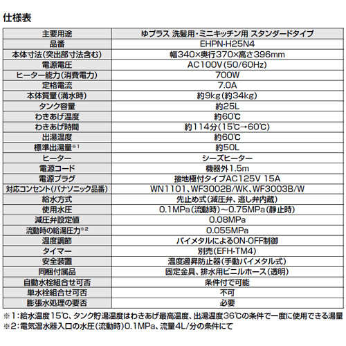 ※2:電気温水器入口の水圧(流動時)0.1MPa、流量4L/分の条件にて