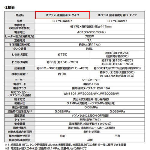 ※1:給水温度15度、タンク貯湯温度はわきあげ最高温度、出湯温度36度の条件で一度に使用できる湯量
