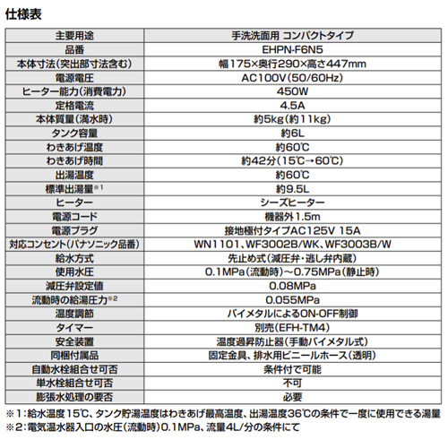 ※2:電気温水器入口の水圧(流動時)0.1MPa、流量4L/分の条件にて