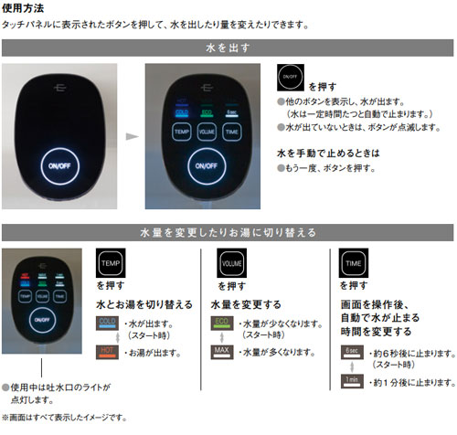 吐水、水量や湯・水の切り替えはタッチパネルにふれるだけのスマートな操作性の水栓です。
