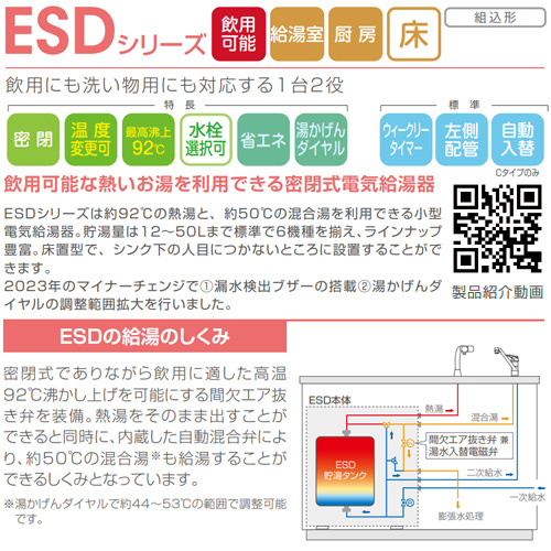 小型電気温水器 ESDシリーズ[床置][先止式][貯湯式][キッチン用][単相200V][1.5kW][12L][わきあげ温度:60〜92度][自動湯水入替機能付][操作部:C][配管向き:右]