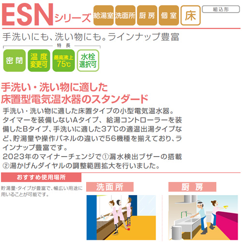 手洗い・洗い物に適した床置型電気温水器のスタンダードシリーズ