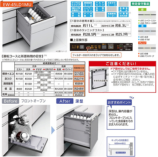 ・運転コース:7コース(標準エコ・念入り・低温・調理器具・乾燥・予約2コース)※予約コースは標準・念入りのみ