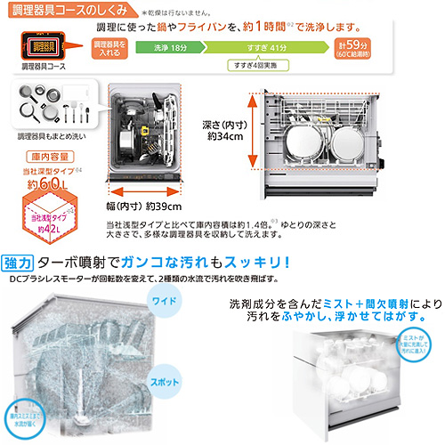 ・運転コース:7コース(標準エコ・念入り・低温・調理器具・乾燥・予約2コース)※予約コースは標準・念入りのみ