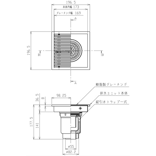 ●浴室排水ユニット[樹脂製グレーチング][非防水層タイプ][縦引きトラップ][200角タイル用][長さ200タイプ][浴槽部材]