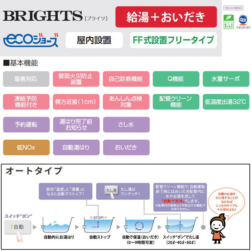 ●ガスふろ給湯器[エコジョーズ][浴室・台所リモコンセット][屋内壁掛型][上方排気][ブライツ][オート][16号][15A]
