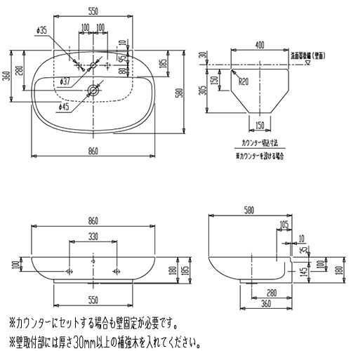 ※カウンターを設ける場合も洗面器の壁固定が必要です。