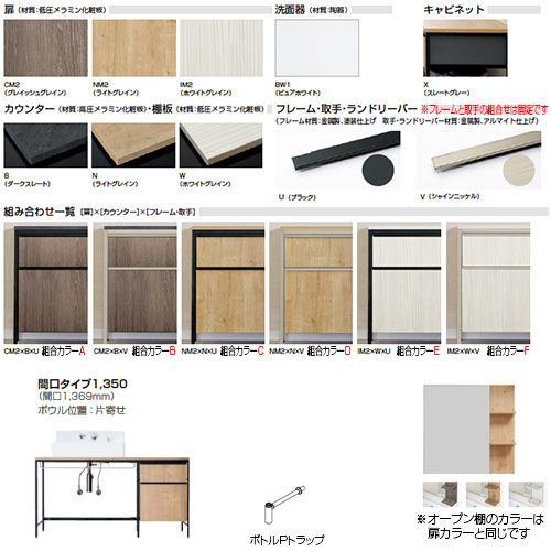 扉カラー・ミラーオープン棚×カウンター・棚板×フレーム・取手カラー・ランドリーバー