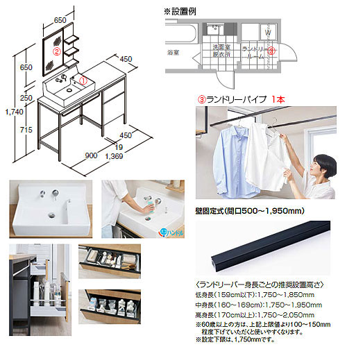 ※プランは上記の記載の仕様ですが、ランドリーパイプ本数やカラー、ボウル位置、壁床排水、水栓の寒冷地仕様など仕様が変更可能です。