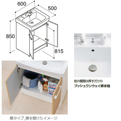 化粧台本体 オフト[間口600mm][扉タイプ][シングルレバー洗髪シャワー水栓][プッシュワンウェイ式][一般地]