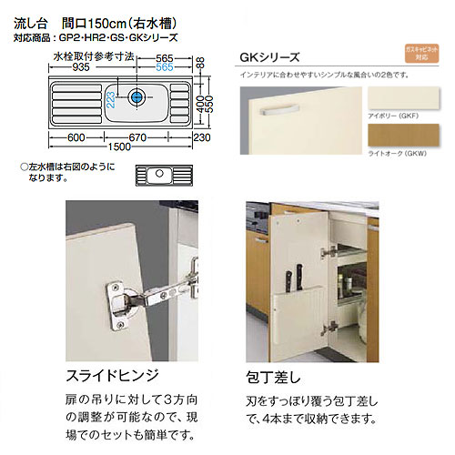 流し台(1段引出し) セクショナルキッチンGKシリーズ[木製キャビネット][間口150cm][ライトオーク]