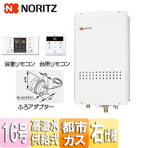 ガス給湯器[浴室・台所リモコン+ふろアダプターセット][PS扉内設置型][後方排気][高温水供給式][クイックオート][16号][15A][都市ガス][ふろアダプター右仕様]