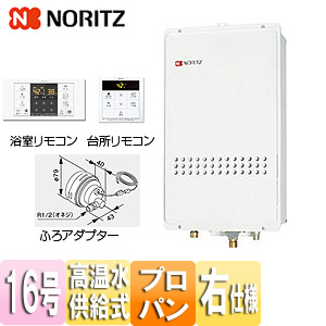 ガス給湯器[浴室・台所リモコン+ふろアダプターセット][PS扉内設置型][後方排気][高温水供給式][クイックオート][16号][15A][プロパンガス][ふろアダプター右仕様]